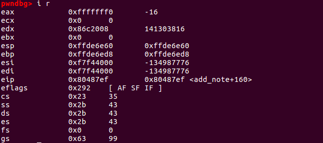 我们可以先看看执行shellcode时的寄存器状况(断在了地址0x080487ef,即 call puts