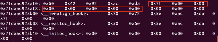 因为libc中常利用的函数指针为__malloc_hook和__free_hook,并且题目中的DoubleFree还需要构造size大小合适的伪堆块,所以需要动态调试观察这两个函数指针附近是否可以满足伪堆块的利用条件: