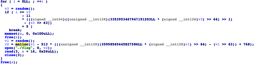 简而言之,这里是一个[0x300, 0x500]范围内随机大小的chunk,而我们只需要申请这个大小中的chunk,就有可能申请到里面含有flag的chunk,那么如何泄露出来呢?