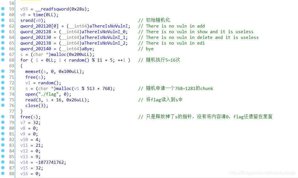 发现进行了一堆意义不明的malloc,但是最后一次会把flag写入chunk且并没有清零