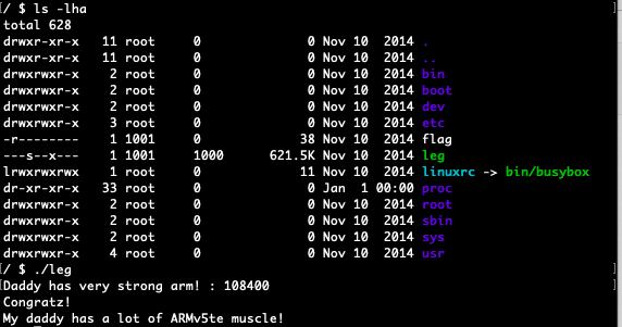 | #include <stdio.h> #include <fcntl.h> int key1(){ asm("mov r3, pc\n"); } int key2(){ asm( "push {r6}\n" "add r6, pc, $1\n" "bx r6\n" ".code 16\n" "mov r3, pc\n" "add r3, $0x4\n" "push {r3}\n" "pop {pc}\n" ".code 32\n" "pop {r6}\n" ); } int key3(){ asm("mov r3, lr\n"); } int main(){ int key=0; printf("Daddy has very strong arm! : "); scanf("%d", &key); if( (key1()+key2()+key3()) == key ){ printf("Congratz!\n"); int fd = open("flag", O_RDONLY); char buf[100]; int r = read(fd, buf, 100); write(0, buf, r); } else{ printf("I have strong leg :P\n"); } return 0; }