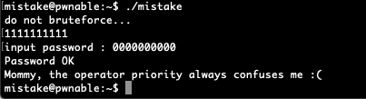 但是题目提示并不需要什么操作,提示运算符优先级,那么去代码审计就好了,可以定位到这行语句 if(fd=open("/home/mistake/password",O_RDONLY,0400) < 0),看起来很正常,是判断是否open成功的语句,但实际上忽略了优先级的问题,最后实际情况是 fd = 0,而在linux中,0这个文件描述符指代的是stdin,即标准输入流,也就是说,这里比较的两个字符串,都是我输入的,那么获取flag也就轻而易举了,我们只要输入两个异或可得0x1的字符就可以了,例如 1(0x31)和 0(0x30)