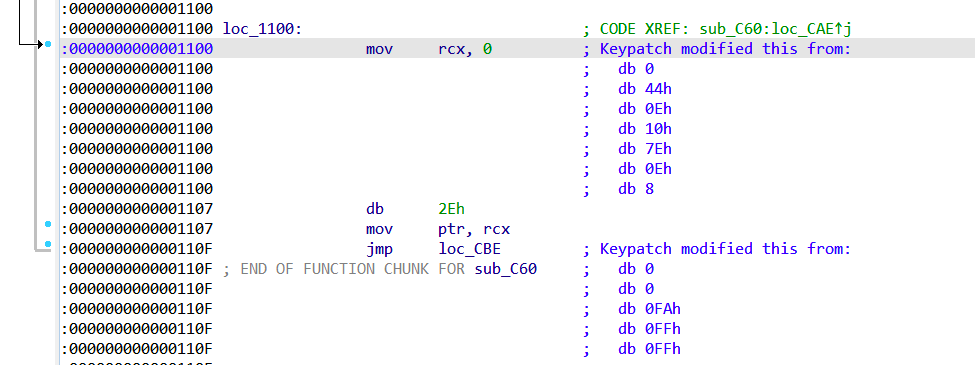 但是写着写着我发现有点不对劲,这一个个偏移算的很烦,而且有的指令还看起来不太对劲,比如mov [rsp+18h+var_10], rax,我还没办法用keypatch直接改,仔细想想,我为什么要重复写这么一大坨玩意呢,我需要的只是加上几行命令而已,直接把一行改成跳转然后执行完了再跳回去不就得了。