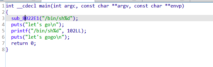 如上,将printf改成了write(0,”/bin/sh%d”,0x20),利用注释的gcc命令将其编译。